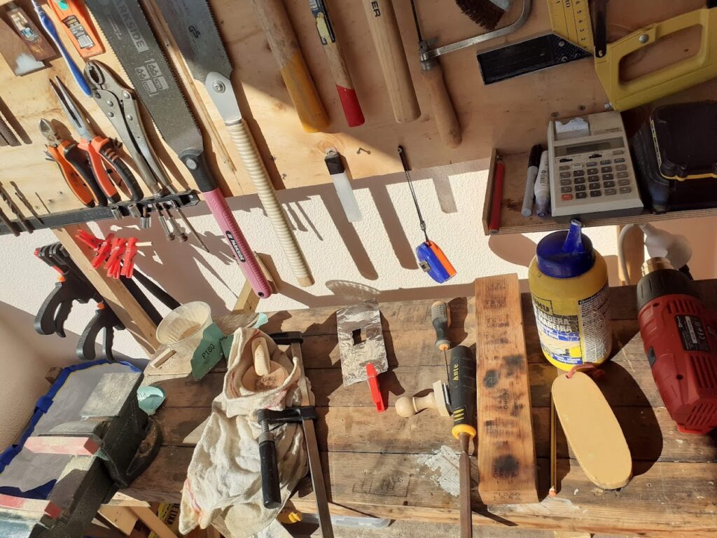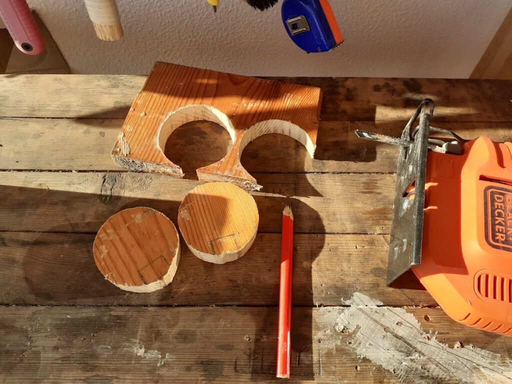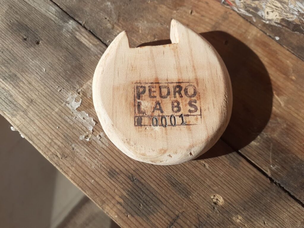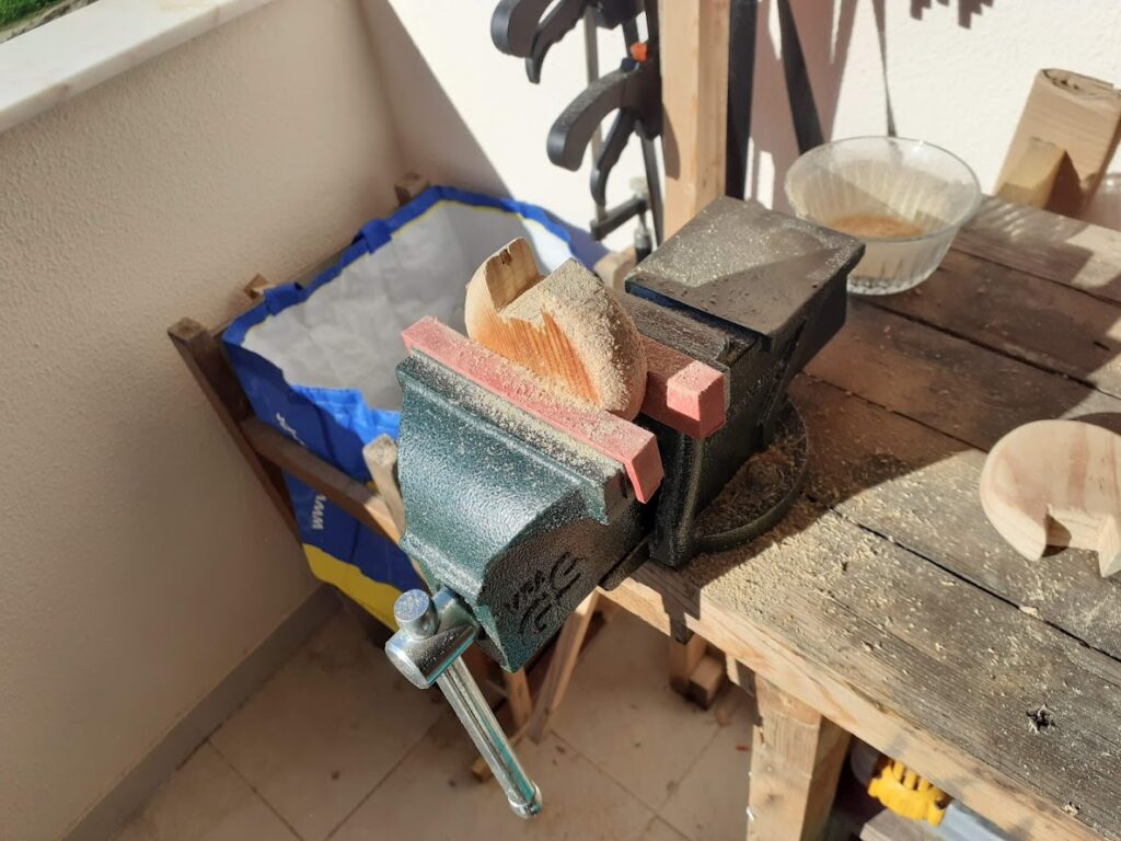 Ele foi feito com um pedaço pequeno de pinus, os cortes circulares foram feitos na tico-tico e o restante todo na grosa, lima e lixa.