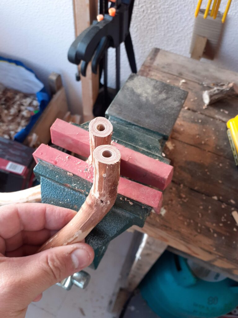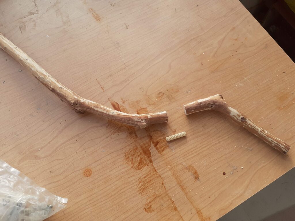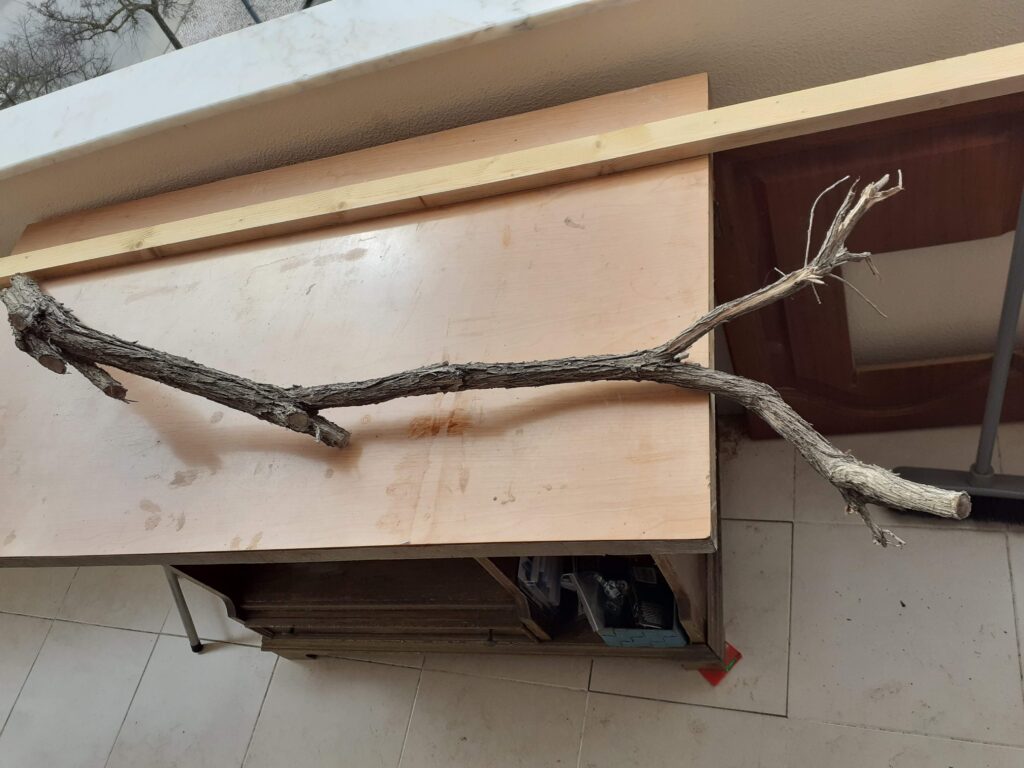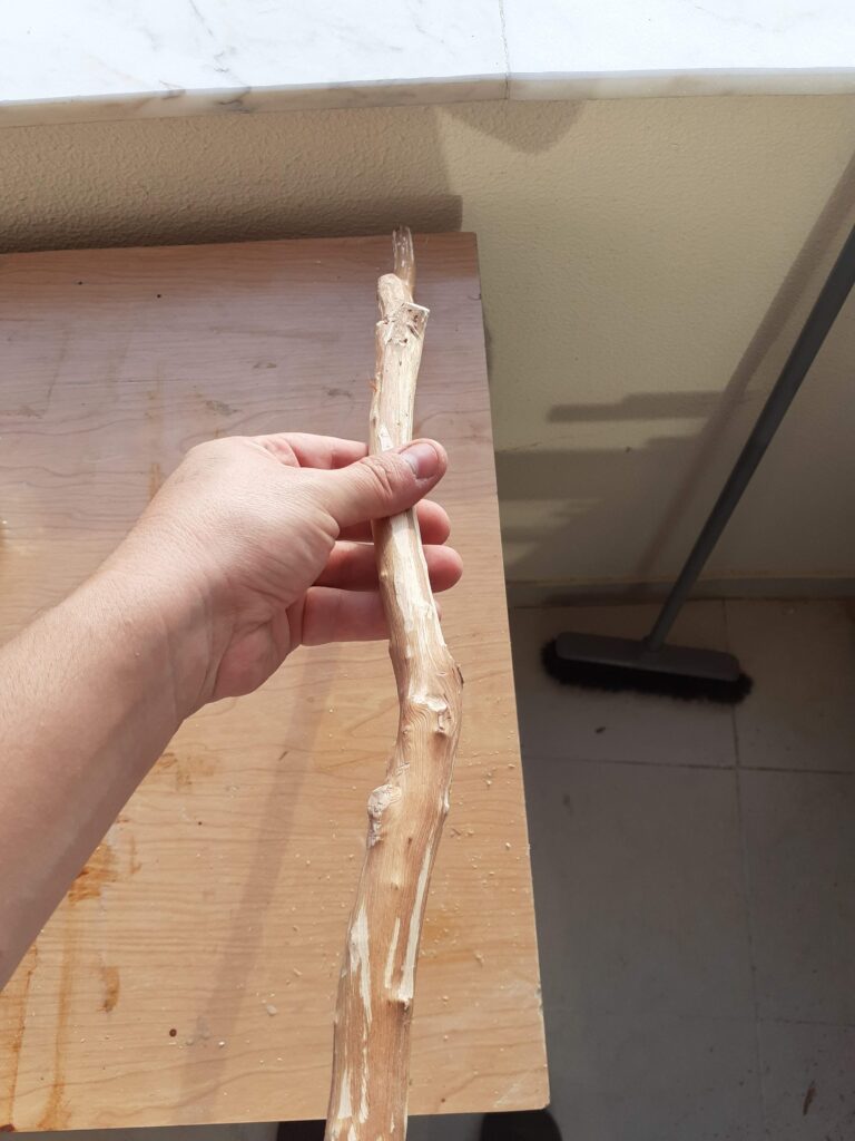 Este galho estava quase perfeito para ser usado na peça porém ele tinha esta ponta torta para o lado que acabaria tirando a peça do plano, então optei por fazer um pequeno “ajuste” para deixa-lo reto.