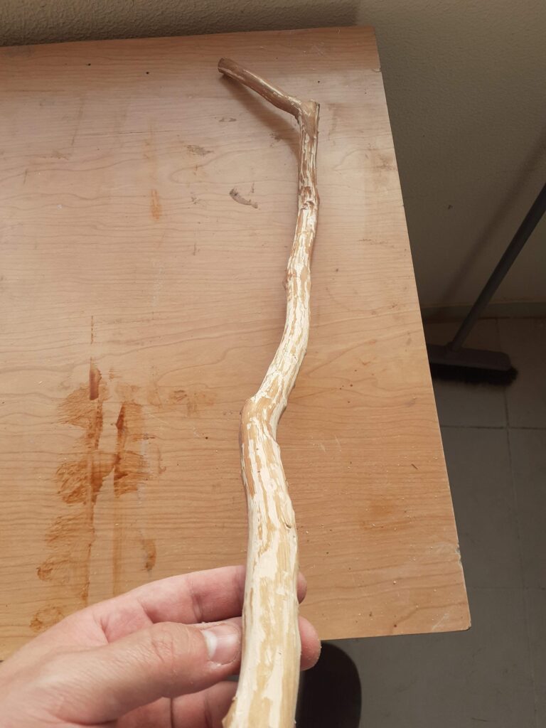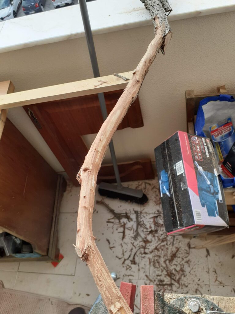 Tudo começa com este galho de oliveira que teve de ser devidamente raspado. Acabei usando uma lâmina de plaina para fazer isso já que não tenho uma ferramenta própria para descascar troncos.