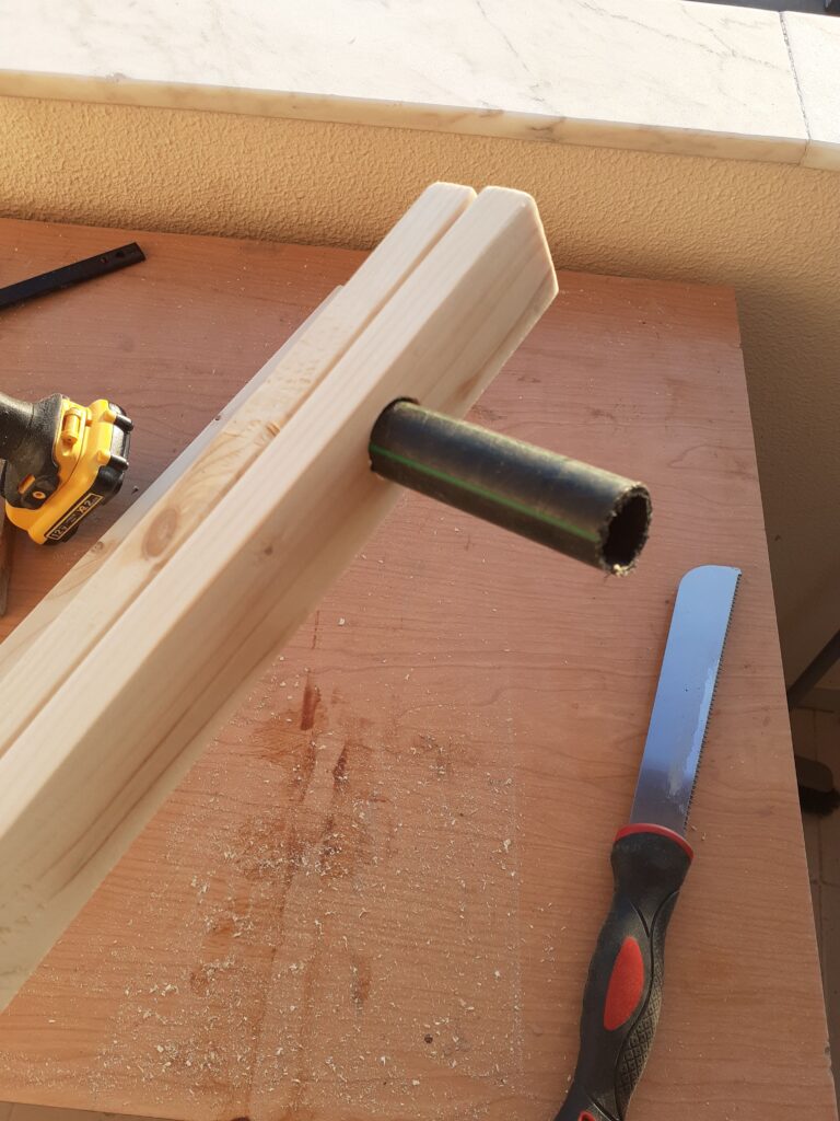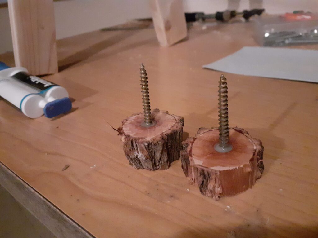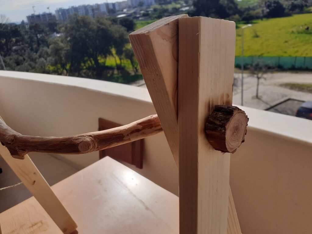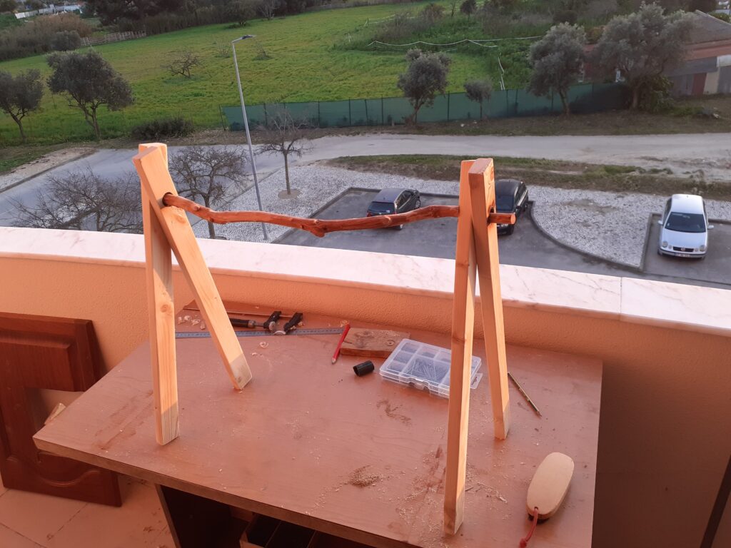 Para fixar o conjunto, foi usado um pequeno pedaço de cano para as pernas ficarem mais juntas e também foi feita uma terminação com um pedaço de oliveira e um parafuso para fazer tudo ficar firme após montado. As pontinhas de oliveira também foram para dar um charme.