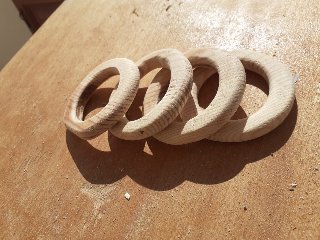 Então para finalizar foram feitas as argolas que ficam penduradas no galho. Elas foram feitas usando um serra copo, grosa, lima e lixa.