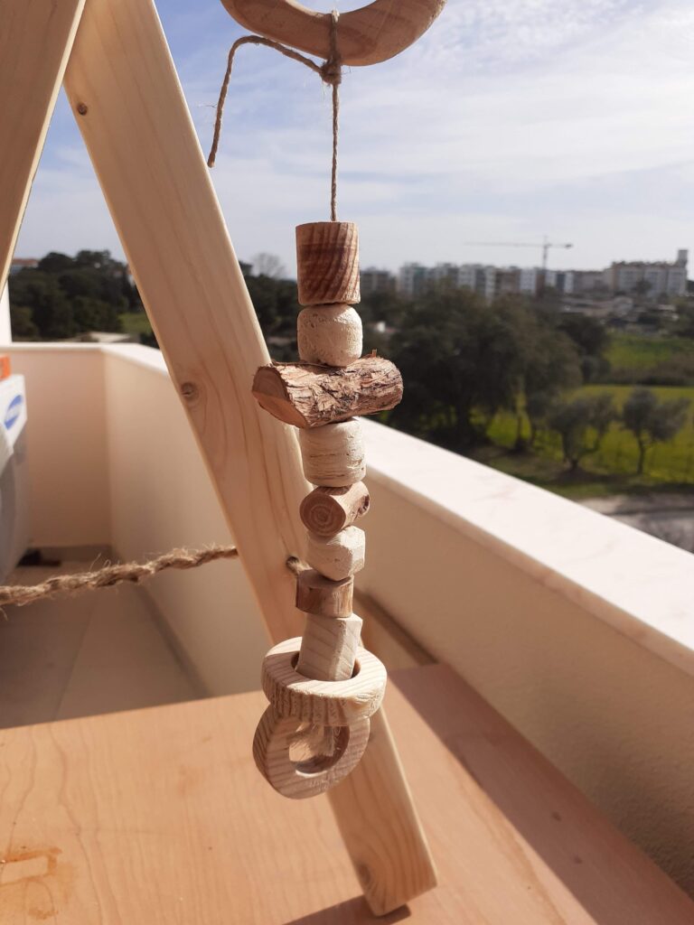 Um típico brinquedo de bebês que eu tentei colocar um pouco mais de elementos com textura. Para isso, usei um galho de oliveira que encontrei na rua há um tempo. Tentei usar o máximo possível dele no projeto para dar uma cara diferente.