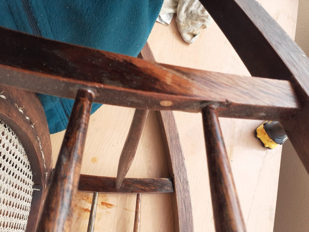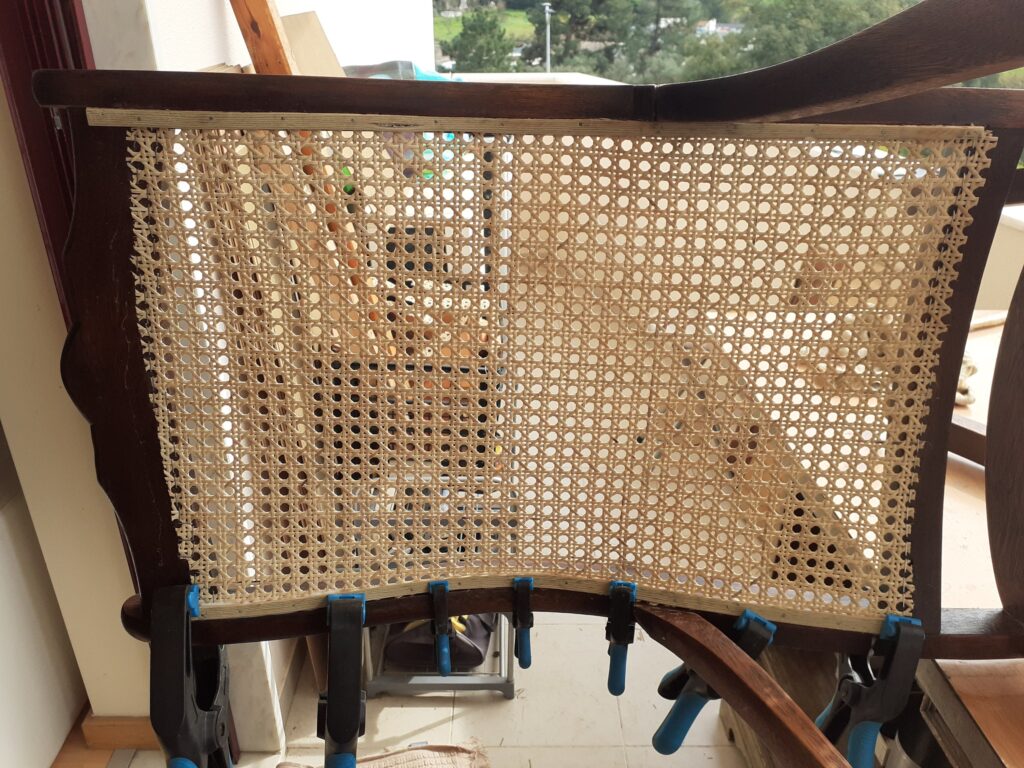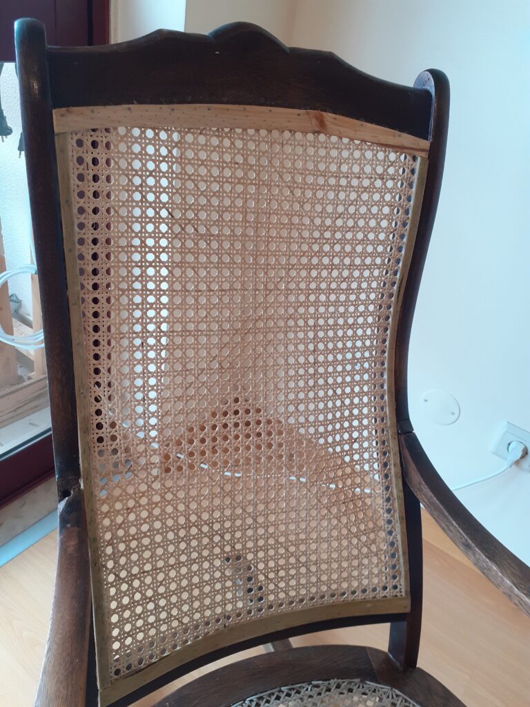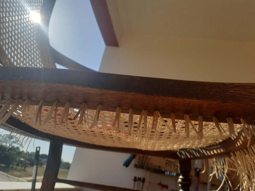A foto acima seria a última desta postagem, porém ao começarmos a sentar(e balançar) na cadeira, a palinha do encosto começou simplesmente a se desfazer e esfarelar. Não estava nos meus planos fazer a troca dela, principalmente porque vi que a forma que ela é fixada na madeira é bem complicada. Cada conjunto de fios é fixado na madeira com uma cavilha e ainda é necessário colocar um fio no mesmo buraco para se fazer o acabamento.