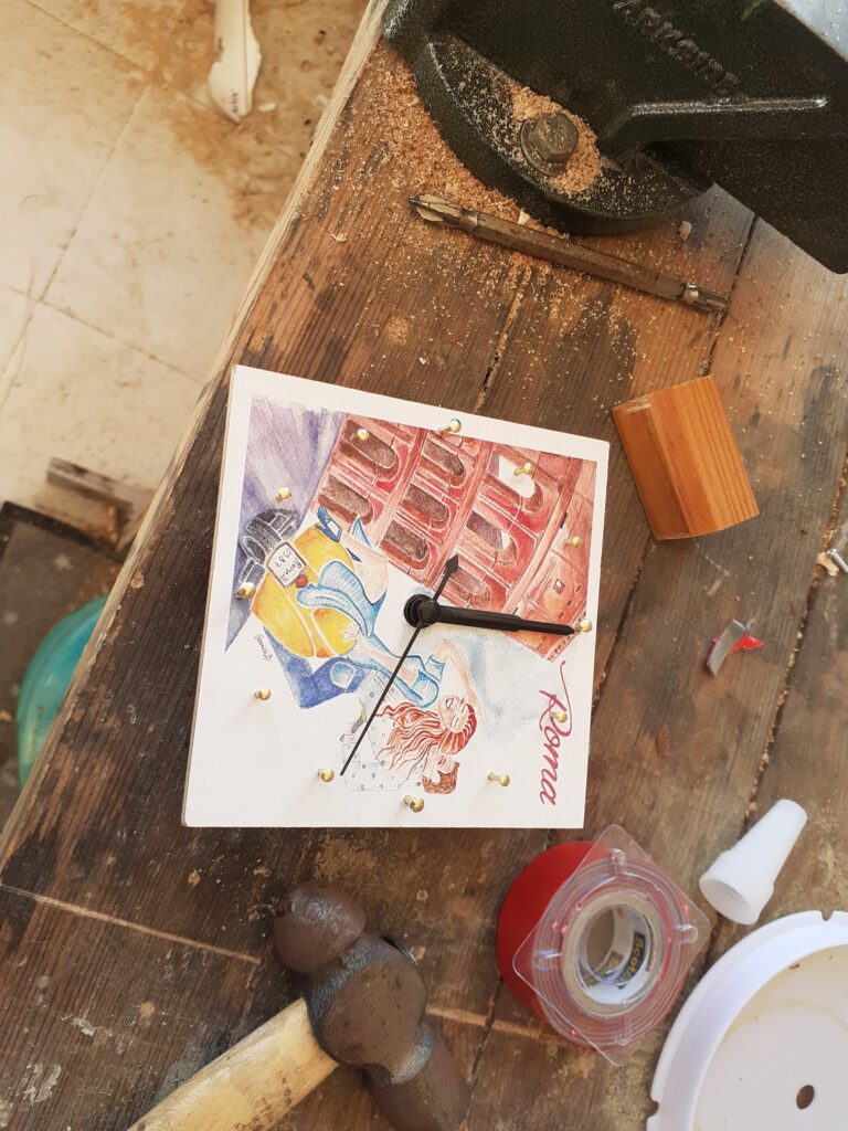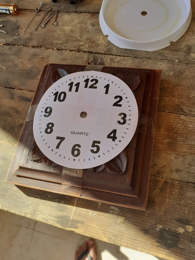 Porém após fazer essa parte, percebi que o mecanismo do relogio é muito curto e precisa de uma superfície bem fina para ser instalado. Mesmo que eu fizesse um entalhe fundo por trás para acopla-la, os detalhes esculpidos são bem profundos e não daria para instalar os ponteiros sem interferir neles.
