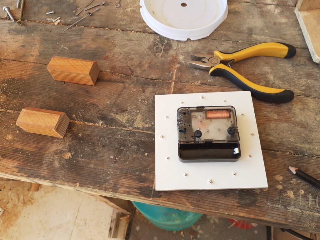 O relógio de parede que tinhamos na cozinha caiu e quebrou. Mas a caixinha do mecanismo continuou bem. Então eu a guardei para fazer um relógio novo.