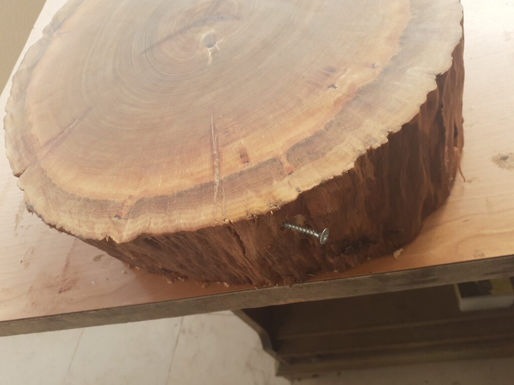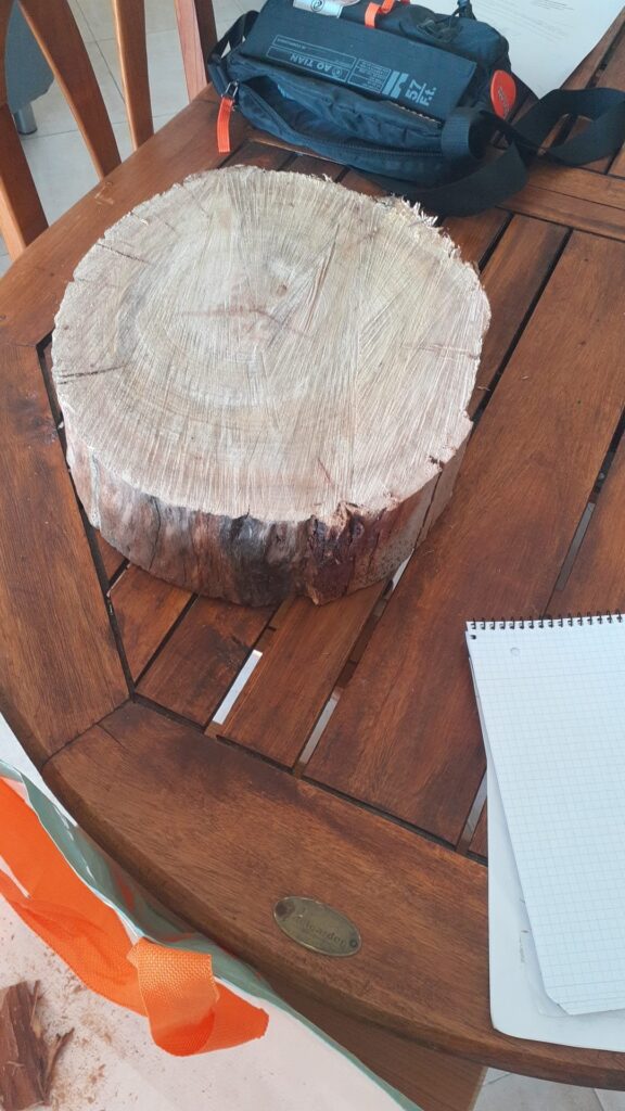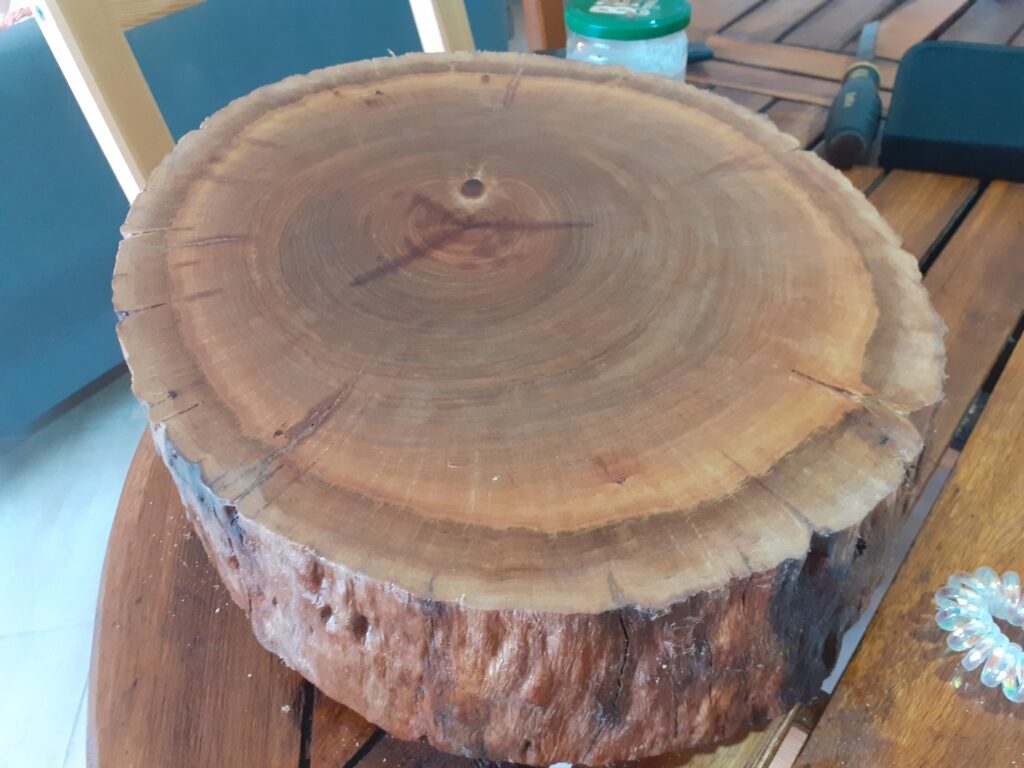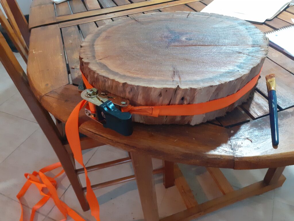 Como esse tipo de madeira por aqui não falta(há dezenas de pontos de venda de lenha) eu só precisava achar um que tivesse alguma boa alma disposta a cortar uma bolacha com a motosserra.
