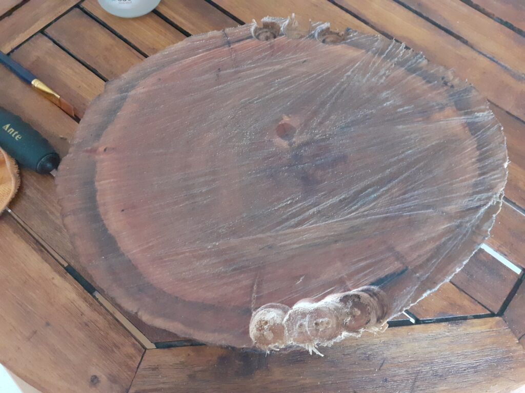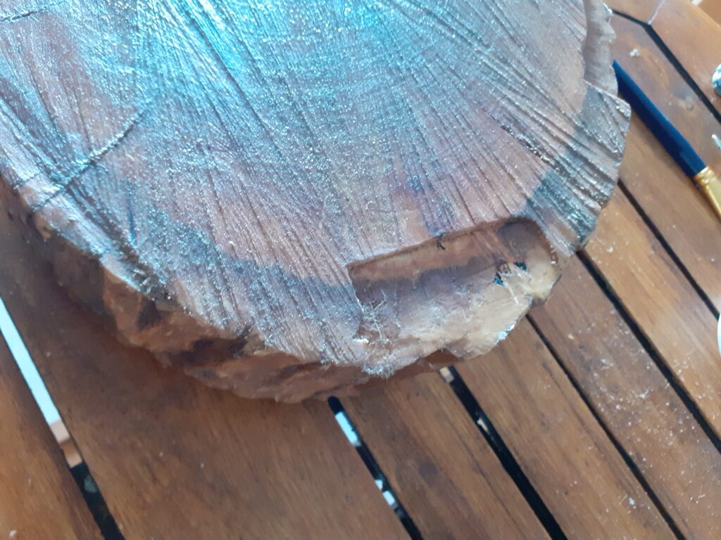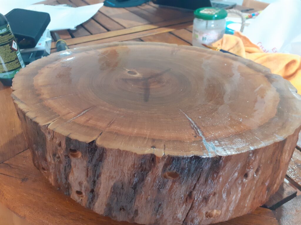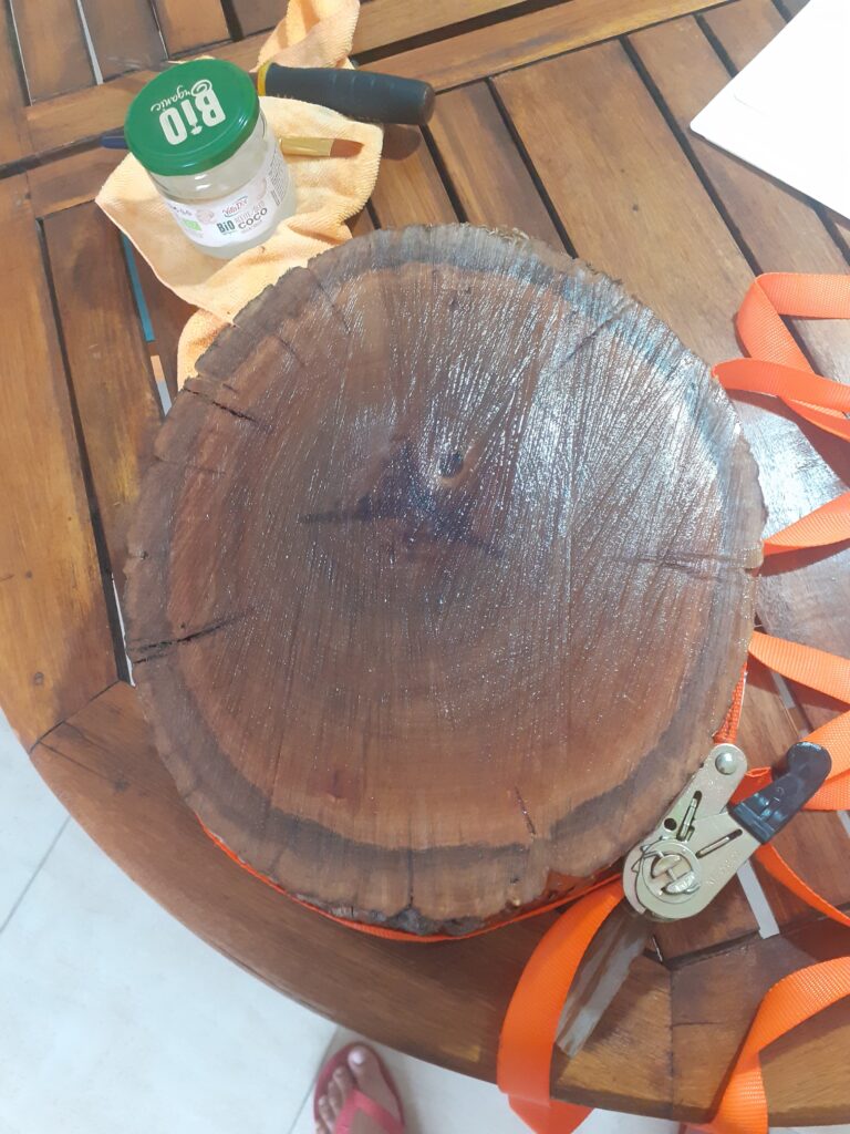 Então agora o trabalho era aplainar um dos lados para tirar as marcas da motosserra, fazer alguns detalhes e principalmente passar óleo e cera para que ela não rachasse imediatamente.