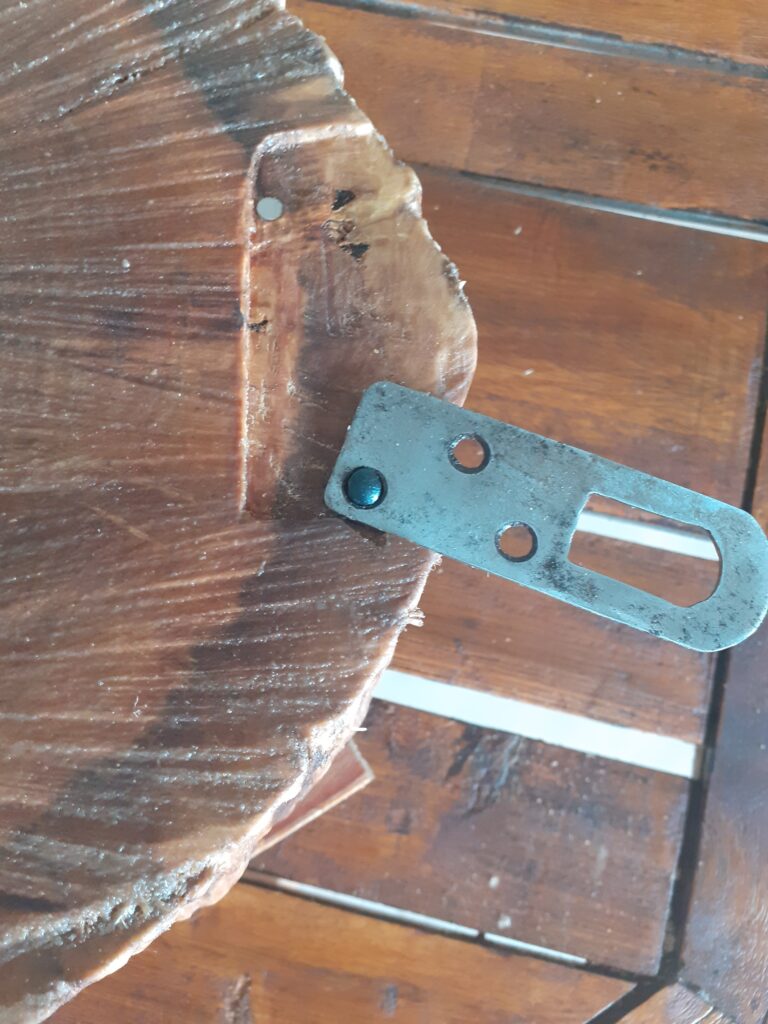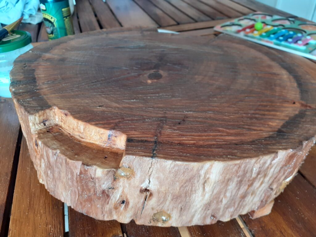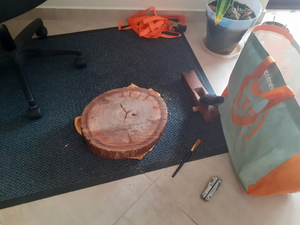 Eu pensei em comprar uma tóra de madeira e mandar para ele, seria muito conveniente se ele não morasse em apartamento. Então resolvi fazer uma solução meio termo, uma tábua de corte bem bruta.